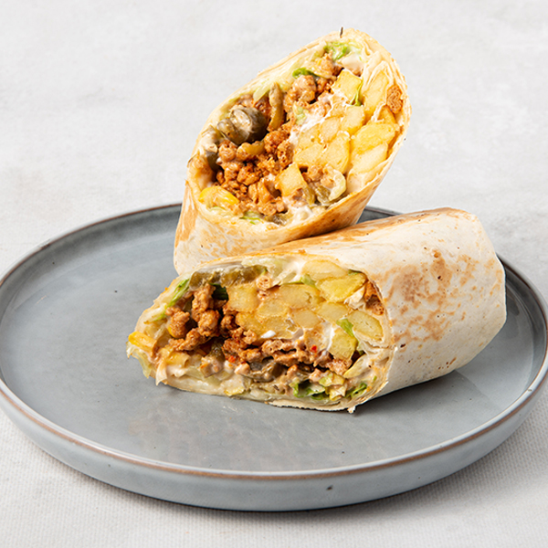 Kalifornijskie burrito z sosem śmietanowo-serowym, serem, sałatą, pomidorem, kukurydzą, frytkami.